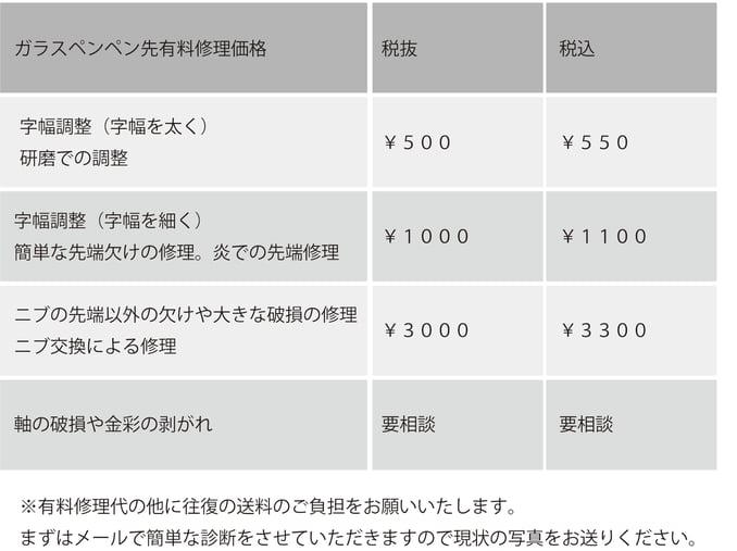 ガラスペンのニブの有料オプション化も実施しペン先の変更修理もお受けできる様になり、
